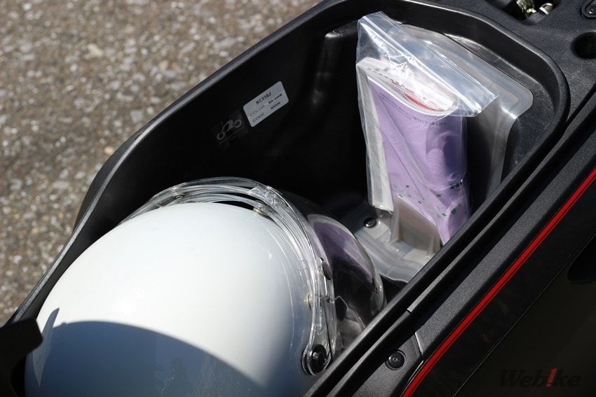 ここまででも原付二種スクーターを選んだ理由は伝わったかと思いますが、さらに「スクーター」を推したい理由がもう一つあります。それはメットインスペースがあることです。自動車と違って収納スペースが限られるバイクにおいて、スクーターのメットインスペースは日常生活で大活躍します。例えば、メットインの中に雨具を常備させることで急な雨でも安心ですし、お買い物で荷物が増えてもメットインにしまうことができます。なによりバイクから降りた後のヘルメットをしまえるので、わざわざヘルメットを持ち歩いたり、バイクにかけておいたりする必要もありません。
